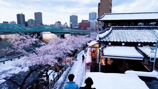 “美丽、白雪皑皑的东京市熙熙攘攘。镜头追随着人们,一同欣赏美丽的雪景和热闹的摊位,感受雪花纷飞,樱花起舞。”(翻译自英文Prompt)